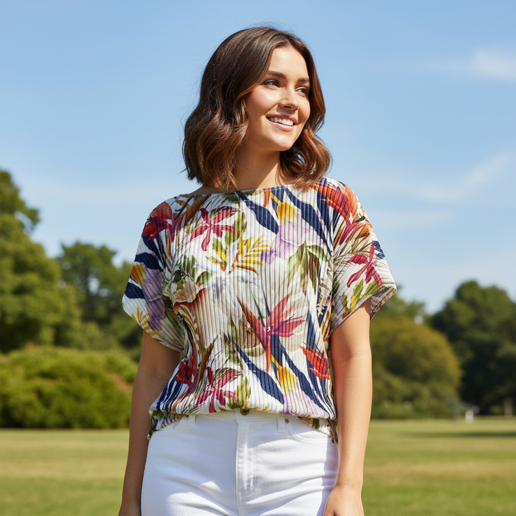 • WOMEN'S SLEEVELESS PLEATED TOP: Jungle Grove